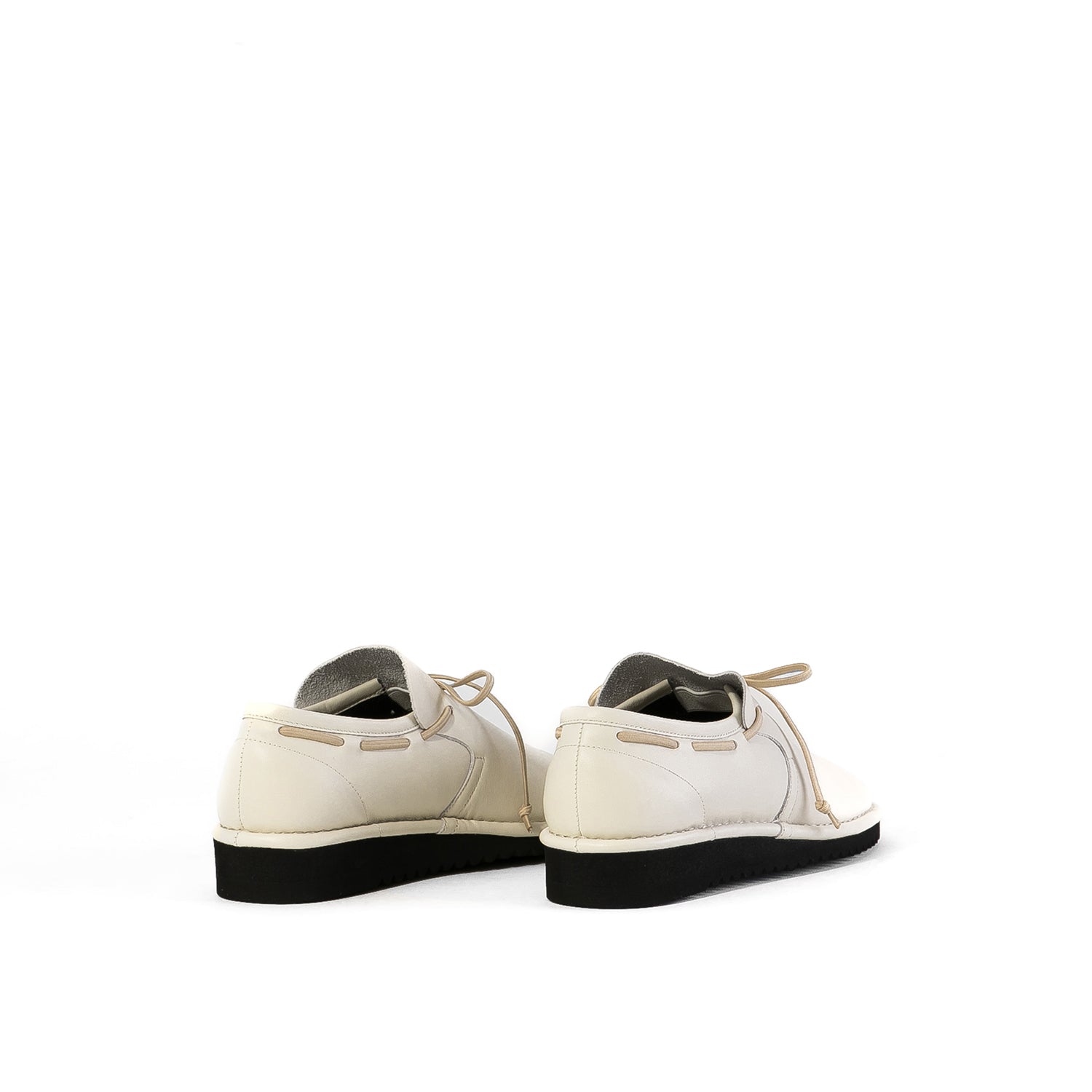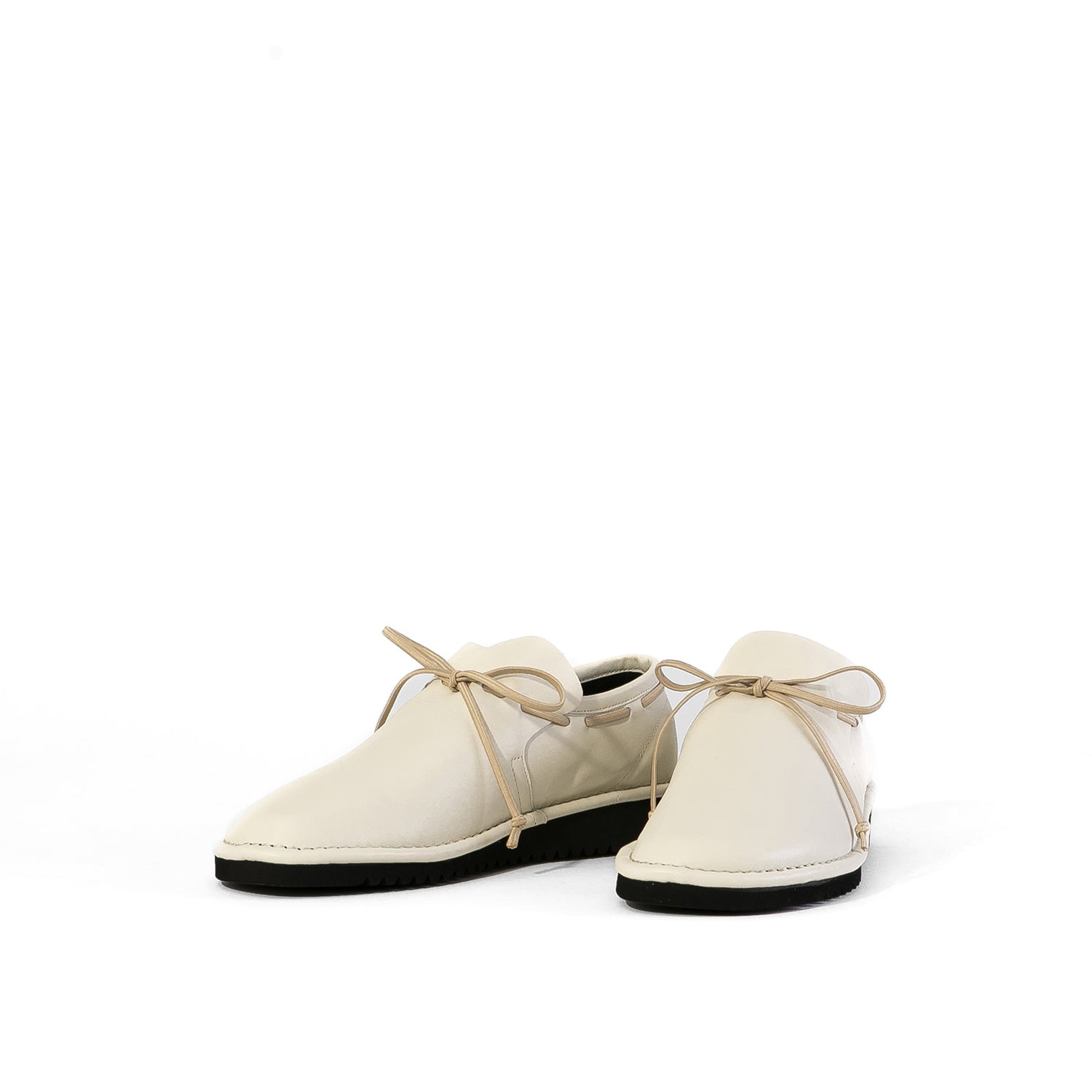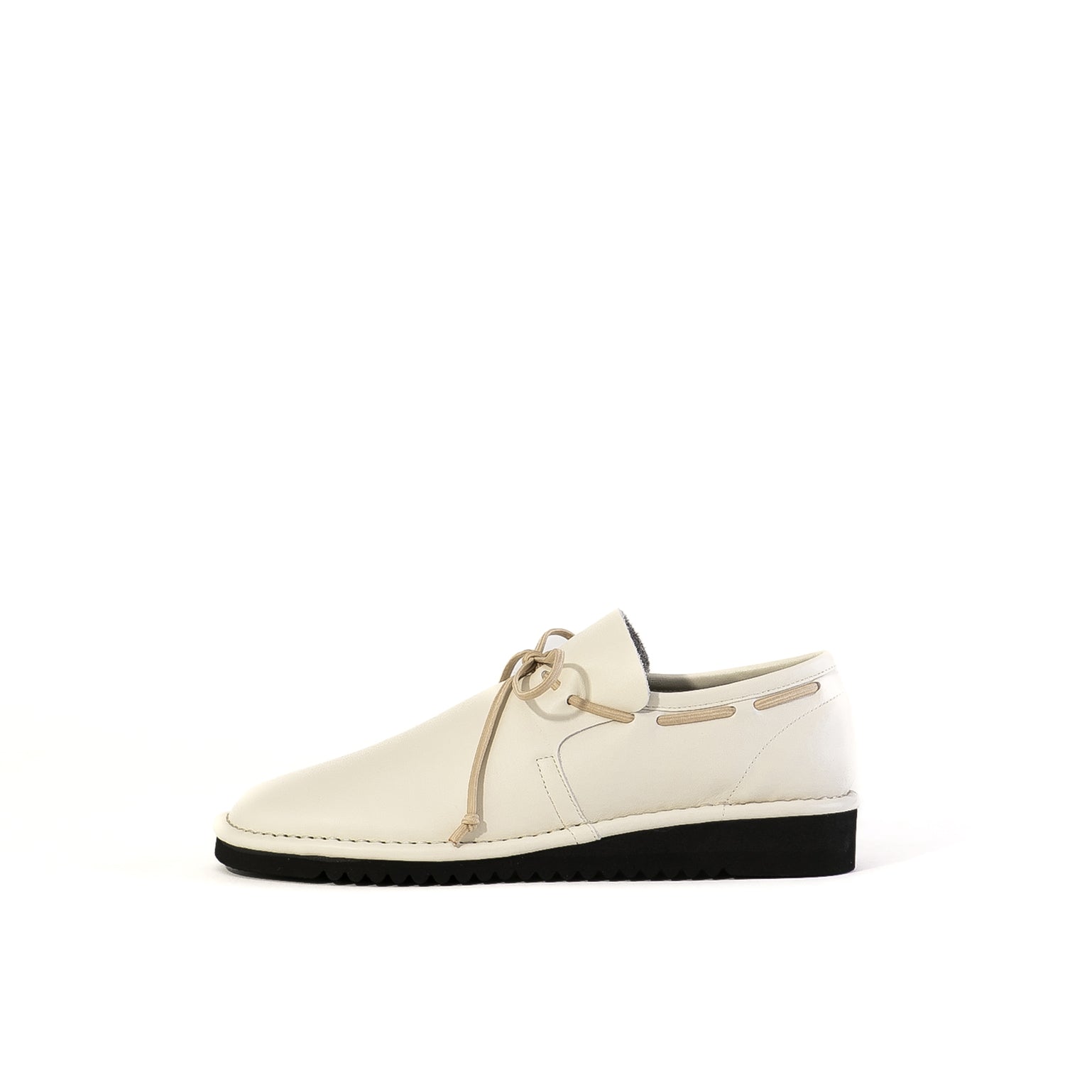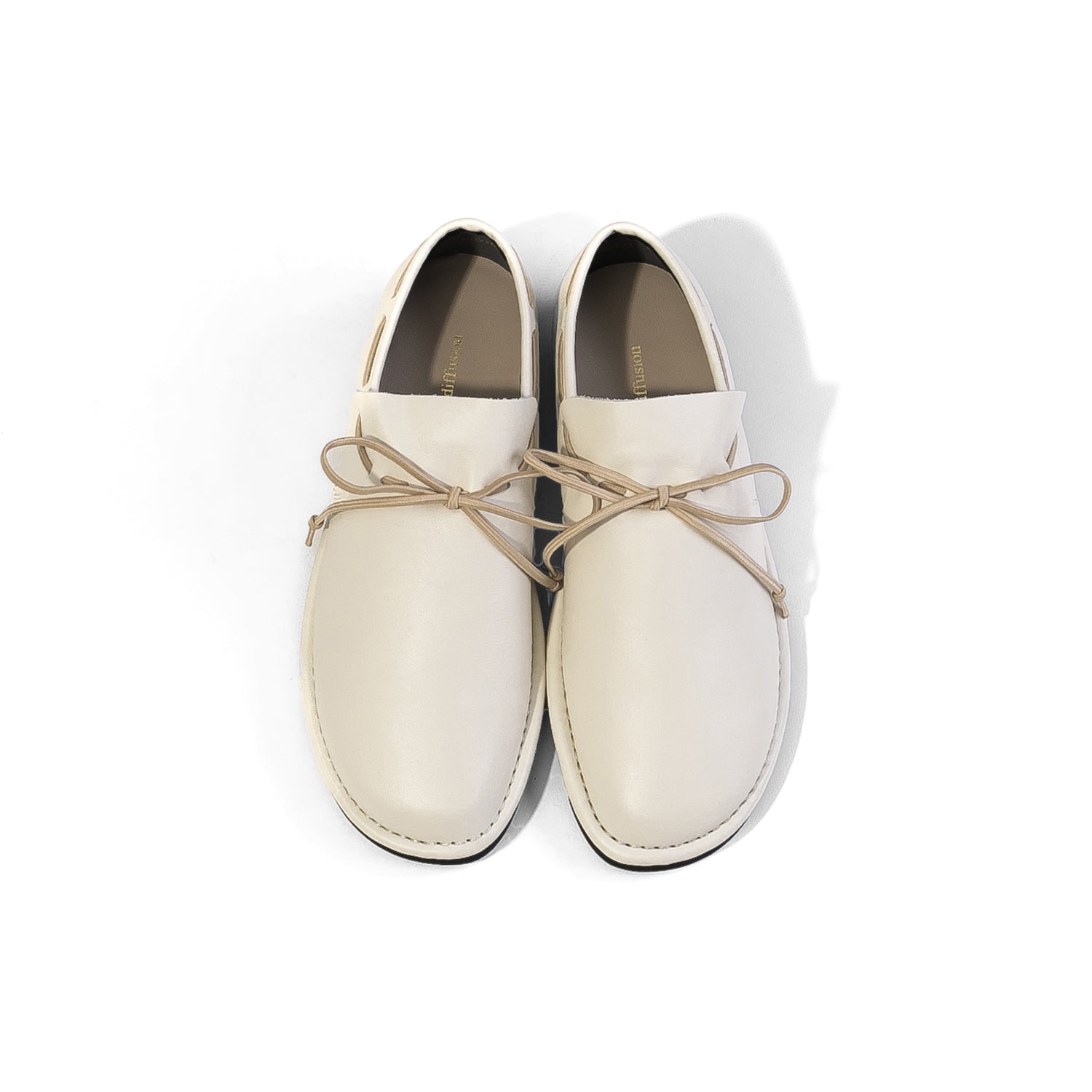 履き口に施したシューレースがアクセント。足によく馴染む本革を使用しています。